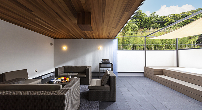 2Fのスカイテラスにはラグジュアリー屋外家具・露天ジャグジー・映像音響システム・本格的なBBQが楽しめるガスグリル、屋内にはリモートブース。